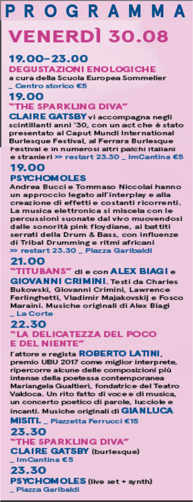 29.8-1.9.2018: Programma completo del Teatro nel Bicchiere 2019