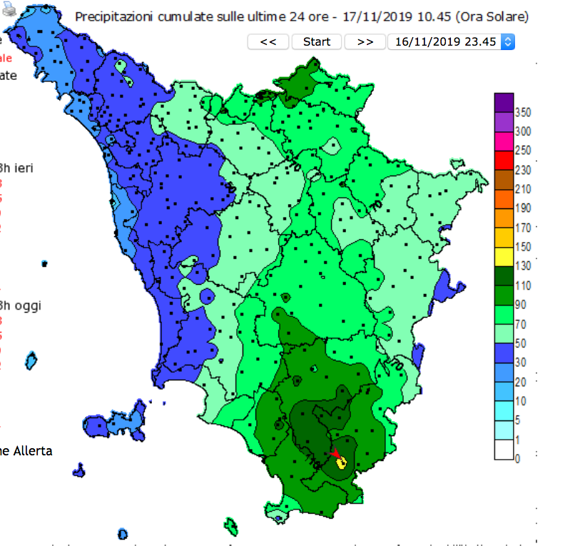 16-17.11.2019: Precipitazioni nelle ultime 24 ore Manciano il punto maggiore con 153,6mm di pioggia dalle 10.45 di rei alle 10.45 di oggi, 17 novembre, in verde scuro il territorio del Comune di Scansano e zone limitrofe dove sono caduti circa 130mm di acqua. Condividi: Fai clic per condividere su X (Si apre in una nuova finestra) X Altro Fai clic per condividere su Facebook (Si apre in una nuova finestra) Facebook Mi piace Caricamento...