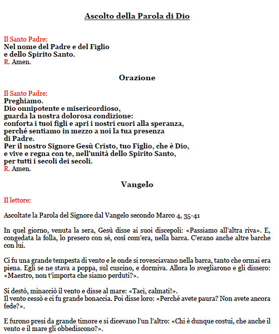 27.3.2020, ore 18: Cerimonia religiosa con Papa Francesco. Dove seguirla e il Libretto della Cerimonia