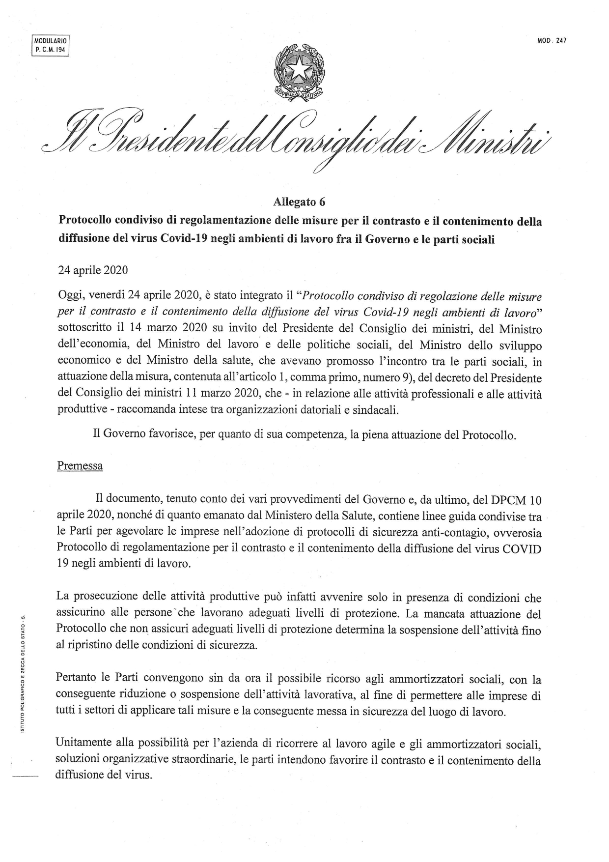 26.4.2020: Il Testo integrale con gli allegati del DPCM sulla Fase 2