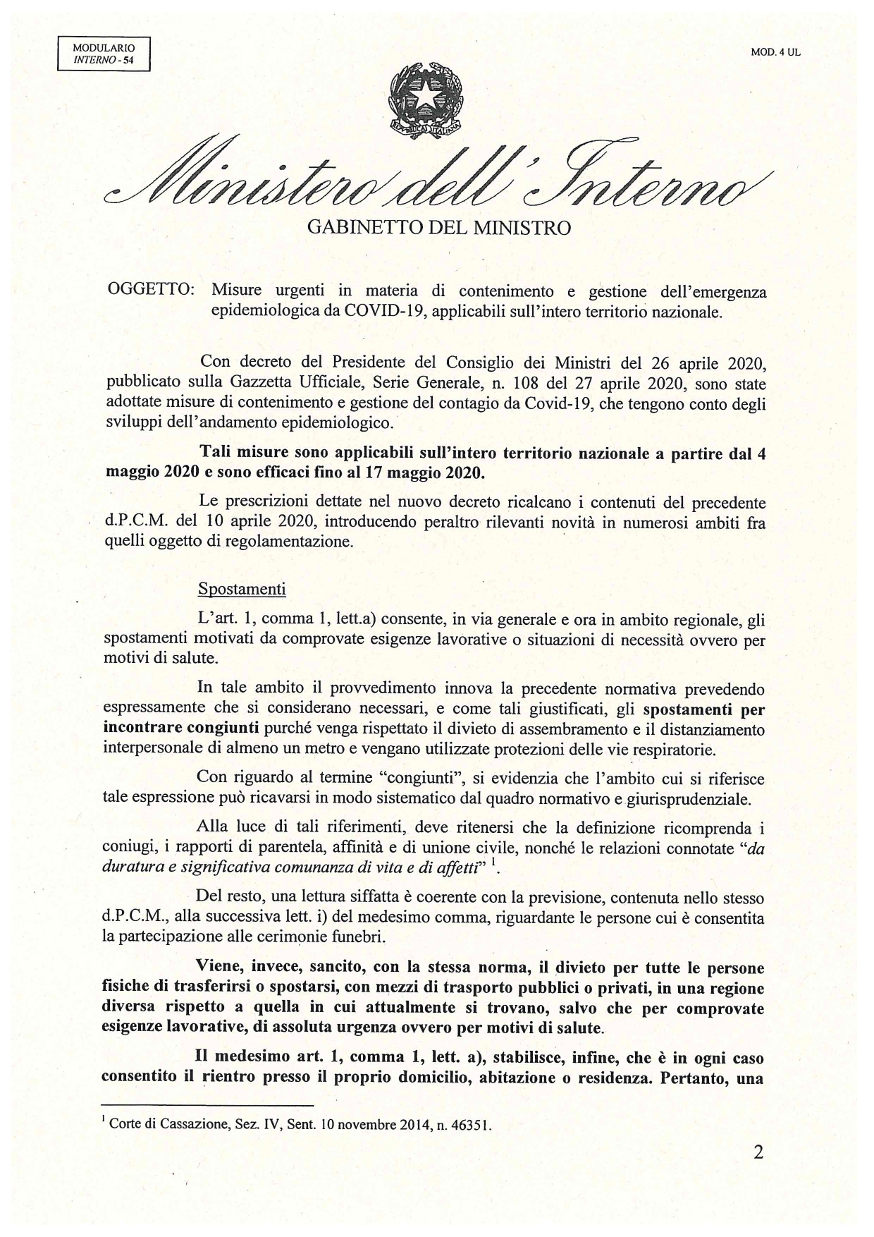 Circolare del Ministero dell’interno ai prefetti sulle misure della Fase 2