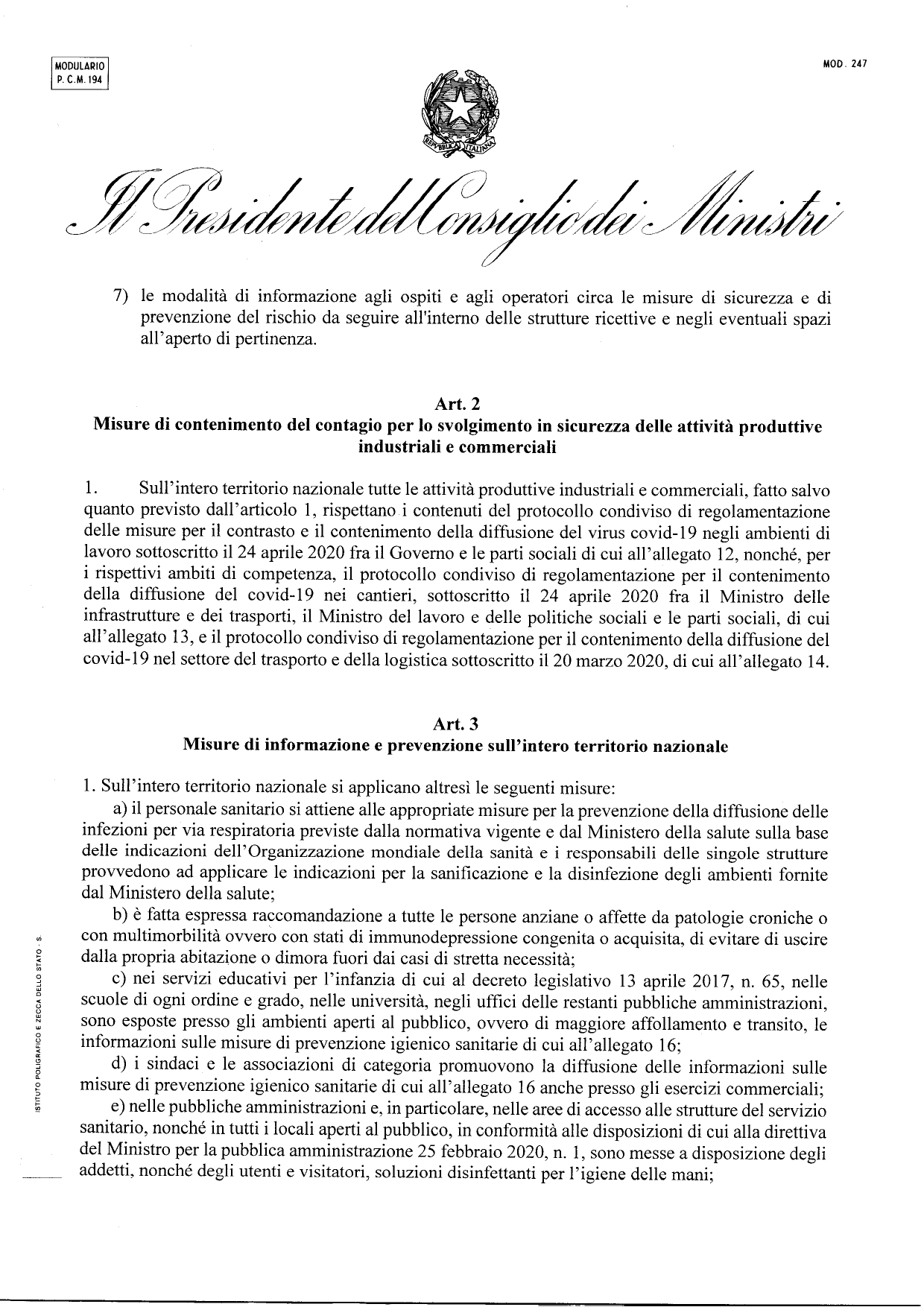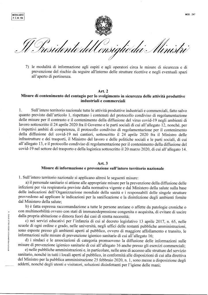 17.5.2020: Il Testo appena firmato dal Presidente Conte il DPCM sulle aperture dal 18 maggio
