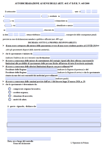 18.5.2020: Il nuovo modulo di autodichiarazione (per lo spostamento tra regioni) Cliccare per caricare il PDF del nuovo modello autodichiarazione, 18 maggio 2020, da utilizzare per gli spostamenti tra regioni diverse Condividi: Fai clic per condividere su X (Si apre in una nuova finestra) X Altro Fai clic per condividere su Facebook (Si apre in una nuova finestra) Facebook Mi piace Caricamento...