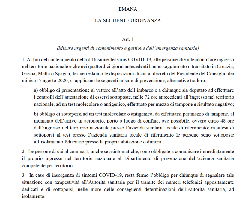 12.8.2020: Nuova ordinanza del Ministero della Salute che prevede test molecolare o antigenico, da effettuarsi con tampone, per chi arriva da Croazia, Grecia, Malta e Spagna.
