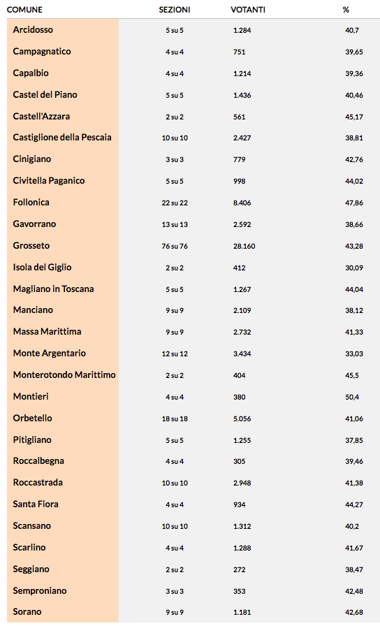 Media di votanti nella provincia 41,87% ovvero 74.250 votanti su 177.323 aventi diritto. Nella figura seguente i dati comune per comune.