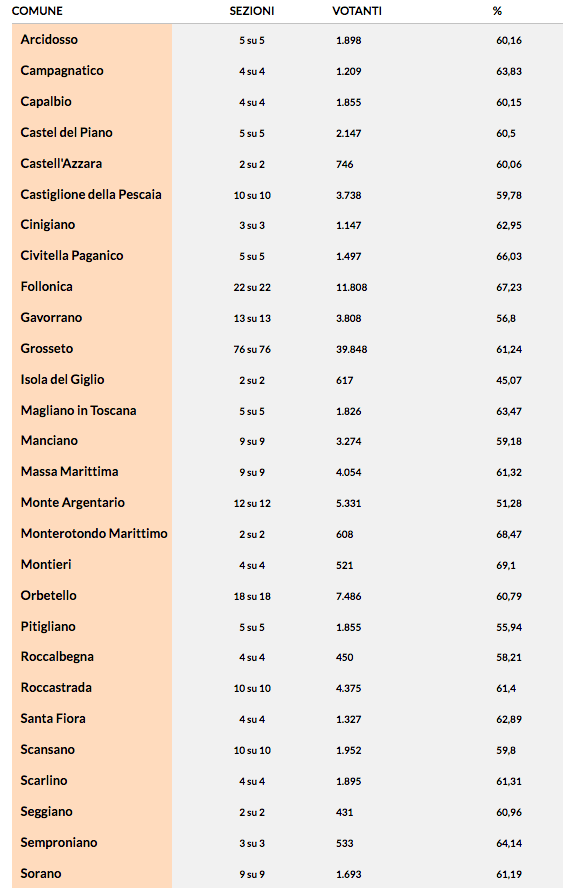 Media di votanti nella provincia 60,87% Votanti ovvero 107.929 votanti su 177.323 aventi diritto. Nella figura seguente i dati comune per comune.