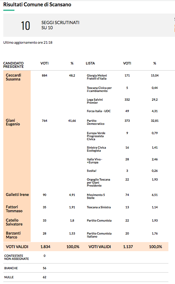 21.9.2020: Elezioni regionali: i risultati finali nel comune di Scansano Condividi: Fai clic per condividere su X (Si apre in una nuova finestra) X Altro Fai clic per condividere su Facebook (Si apre in una nuova finestra) Facebook Mi piace Caricamento...