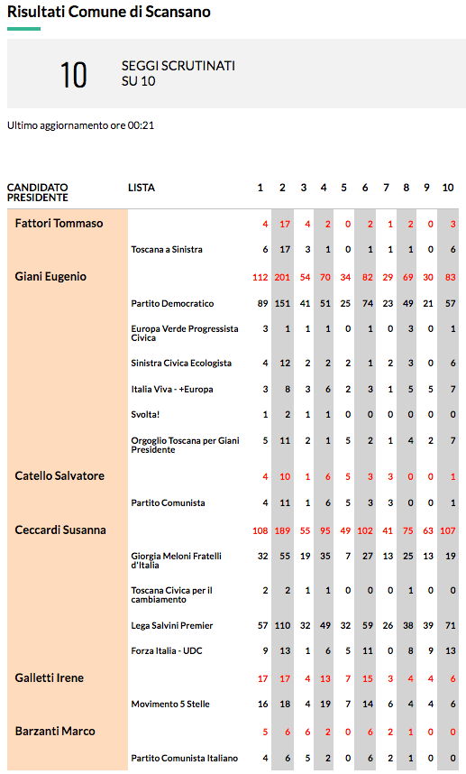 21.9.2020: Elezioni regionali: i risultati finali nel comune di Scansano seggio per seggio Condividi: Fai clic per condividere su X (Si apre in una nuova finestra) X Altro Fai clic per condividere su Facebook (Si apre in una nuova finestra) Facebook Mi piace Caricamento...
