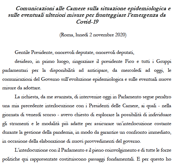 2.11.2020: Testo e video integrale delle comunicazioni alle Camere del Presidente G. Conte sulla situazione epidemiologica e sulle eventuali ulteriori misure per fronteggiare l’emergenza da Covid-19.