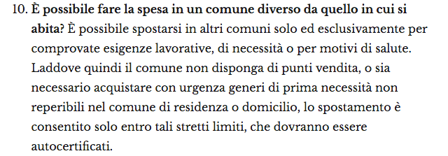 Vista la ufficialità della fonte (sito del Governo italiano) possiamo dunque ritenere superata una delle limitazioni precedenti, limitazione che era particolarmente fastidiosa per chi abita in un piccolo comune senza supermercati o per chi abita in una frazione distante dal capoluogo comunale ma vicina ad un supermercato sito in altro comune. Col chiarimento di oggi la questione è superata, attenzione però, si parla si “un Comune contiguo” ovvero confinante.