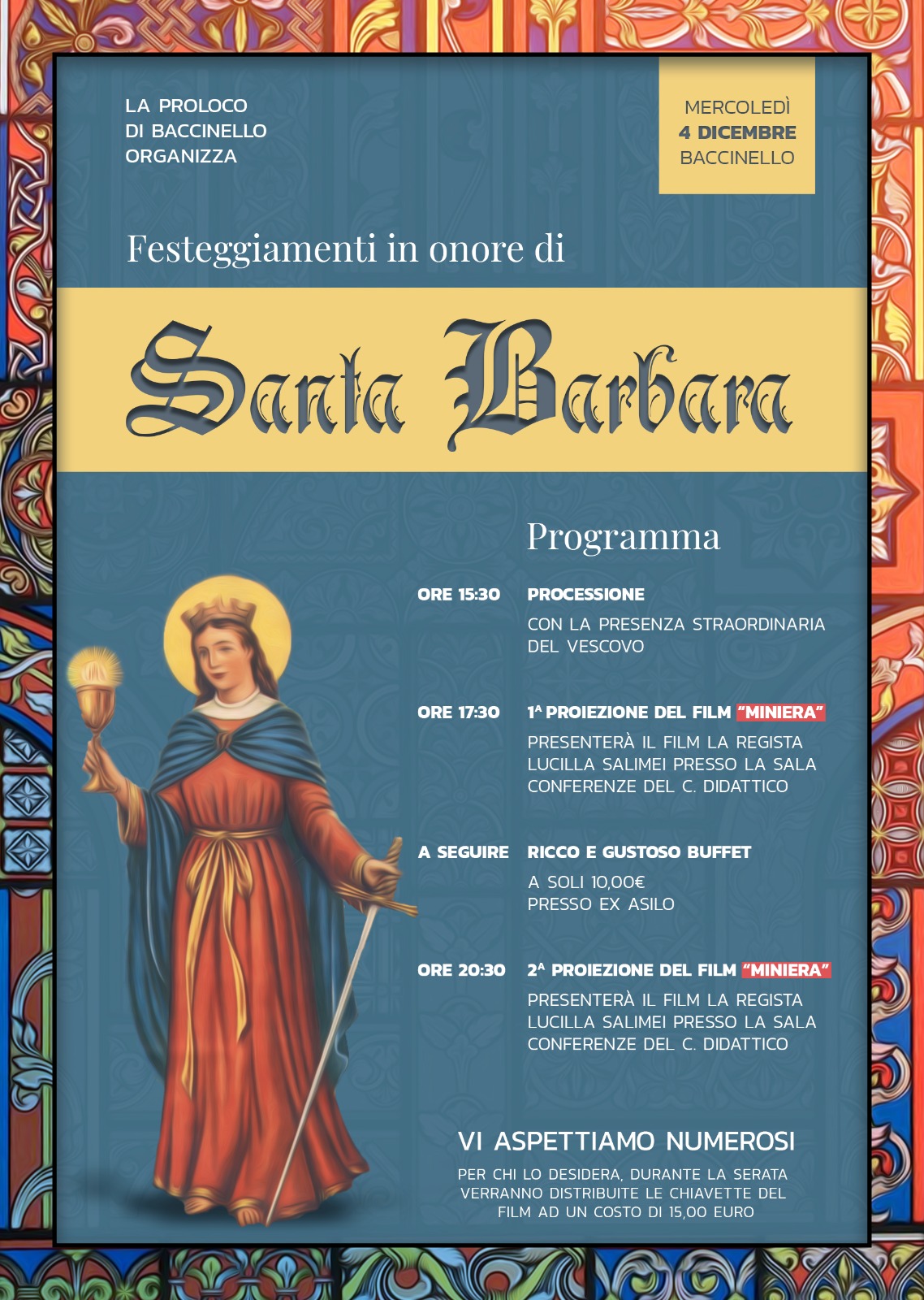Il 4 dicembre p.v., per la festa di Santa Barbara, Patrona dei Minatori, la costituenda Associazione Culturale MINIERA organizza un evento a Baccinello per inaugurare il murale realizzato dal prof. Francesco del Casino sulle facciate del Centro Didattico di Baccinello e mettere una simbolica prima pietra del Centro Culturale Polivalente dedicato alla memoria della miniera. Il Comune di Scansano da il suo patrocinio all’evento al quale parteciperà la Sindaca, Maria Bice Ginesi, e una rappresentanza dell’Amministrazione e del Consiglio Comunale.