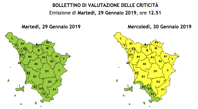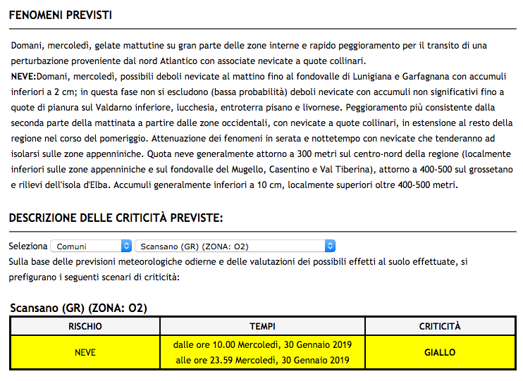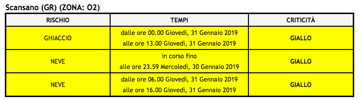 Allerta meteo Gialla per neve dalle ore 10.00 alle ore 23.59 di domani, Mercoledì, 30 Gennaio 2019