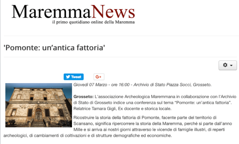 7.3.2019: Conferenza “Pomonte, un’antica fattoria maremmana” all’Archivio di Stato di Grosseto