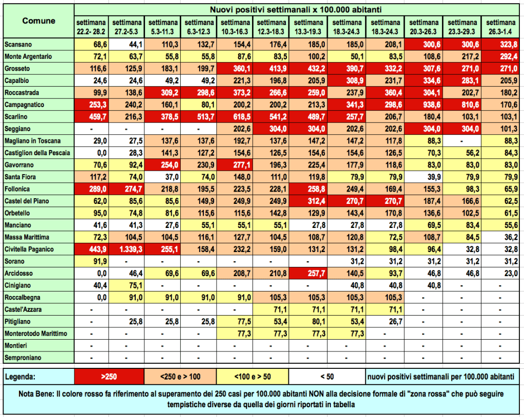 26 marzo – 1° aprile 2021: Scansano peggior Comune per nuovi casi settimanali dopo un mese di costante peggioramento. Tutti i dati di contagiosità dei Comuni maremmani.