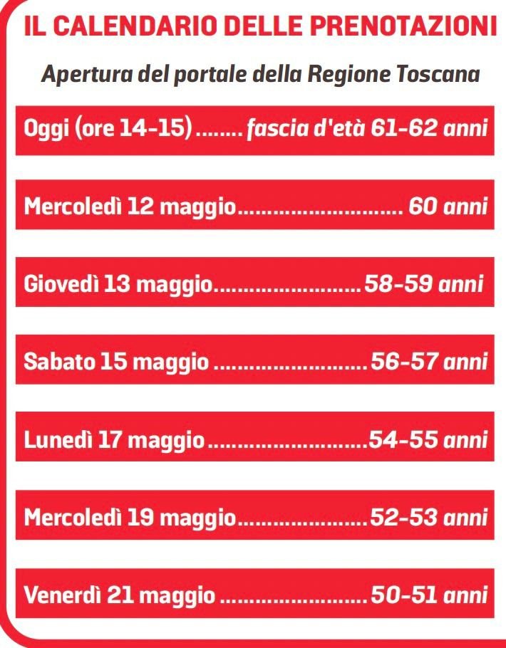 Il nuovo calendario delle prenotazioni vaccinali della Regione Toscana
