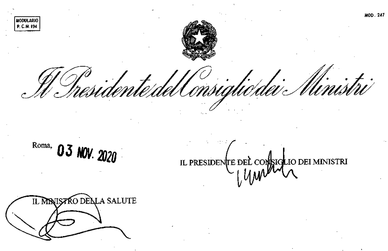 Visto il decreto del Presidente del Consiglio dei ministri 24 ottobre 2020, recante «Ulteriori disposizioni attuative del decreto-legge 25 marzo 2020, n. 19, convertito, con modificazioni, dalla legge 22 maggio 2020, n. 35, recante «Misure urgenti per fronteggiare l’emergenza epidemiologica da COVID-19», e del decreto-legge 16 maggio 2020, n. 33, convertito, con modificazioni, dalla legge 14 luglio 2020, n. 74, recante «Ulteriori misure urgenti per fronteggiare l’emergenza epidemiologica da COVID-19», pubblicato nella Gazzetta Ufficiale della Repubblica italiana n. 265 del 25 ottobre 2020;