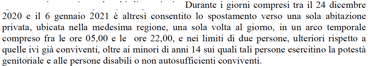Questa norma è dunque valida per tutto il periodo, nei giorni “arancini” ma anche in quelli “rossi”, da 24 dicembre 2020 al 6 gennaio 2021.