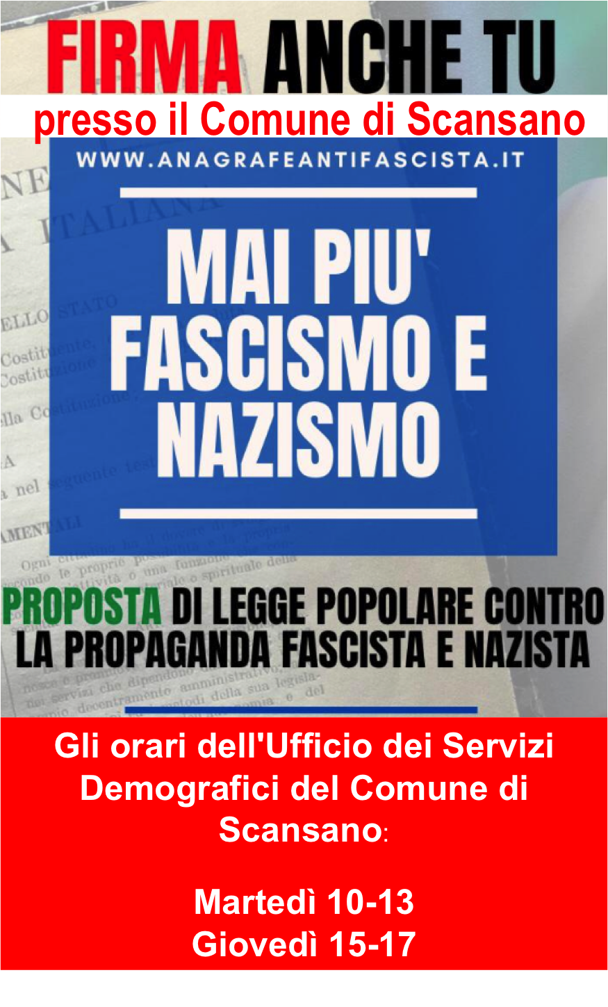 Sono disponibili presso il Comune di Scansano (Ufficio Servizi Demografici) i moduli per la raccolta firme relativi al Progetto di Legge di iniziativa popolare che introduca norme specifiche contro la propaganda e la diffusione di messaggi inneggianti a fascismo e nazismo e la vendita e promozione di oggetti con simboli fascisti e nazisti.