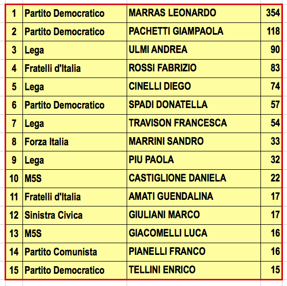 | Europa Verde Progressista Civica | 3 | 1 | 1 | 1 | 0 | 1 | 0 | 3 | 0 | 1 | |