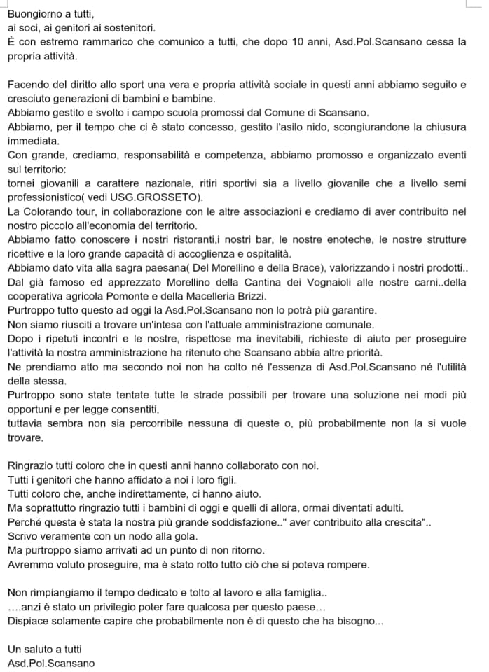 scansano.blog si unisce al rammarico della Cittadinanza per la cessazione delle attività della principale Associazione sportiva del nostro Territorio.
