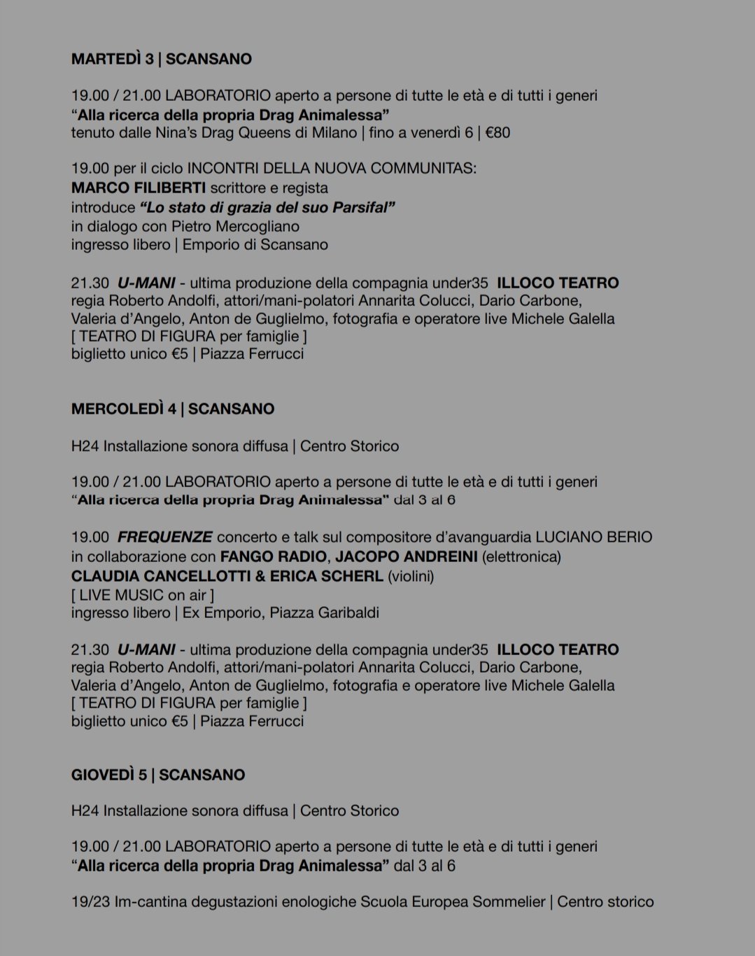 22.30 “La delicatezza del poco e del niente” l’attore e regista ROBERTO LATINI, premio UBU 2017 come miglior interprete, ripercorre alcune delle composizioni più intense della poetessa contemporanea Mariangela Gualtieri, fondatrice del Teatro Valdoca. Un rito fatto di voce e di musica, un concerto poetico di parole, lucciole e incanti. Musiche originali di GIANLUCA MISITI