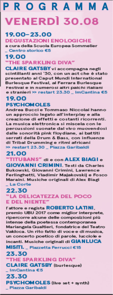 Durante il festival saranno disponibili anche ImCantina Pariboni location delle degustazioni e degli spettacoli di Burlesque.