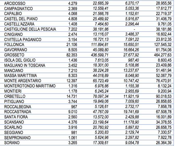- 4a colonna: importo derivante dalla ripartizione in base alla differenza tra il reddito pro capite e il reddito medio nazionale.